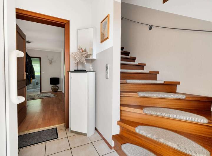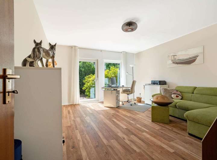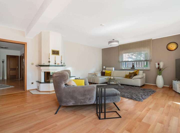 Bereits beim Betreten des Hauses vermittelt der freundliche Eingangsbereich ein einladendes Ambiente. Der zentrale Flur verbindet harmonisch alle Räume der ersten Etage miteinander. Das großzügige Wohnzimmer mit Kamin schafft durch den warmen Laminatboden und die helle Gestaltung eine besonders behagliche Atmosphäre – ein Ort, an dem sich Familie und Freunde gleichermaßen wohlfühlen. Direkt angrenzend liegt ein weiteres Zimmer, das sich hervorragend als Büro oder Home-Office-Bereich eignet und durch den direkten Zugang zu einer eigenen Terrasse zusätzlichen Komfort bietet.