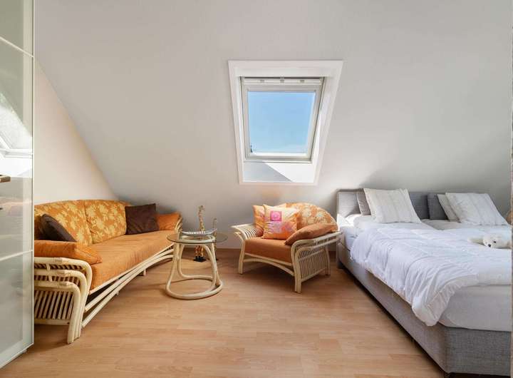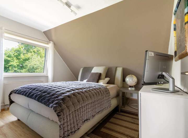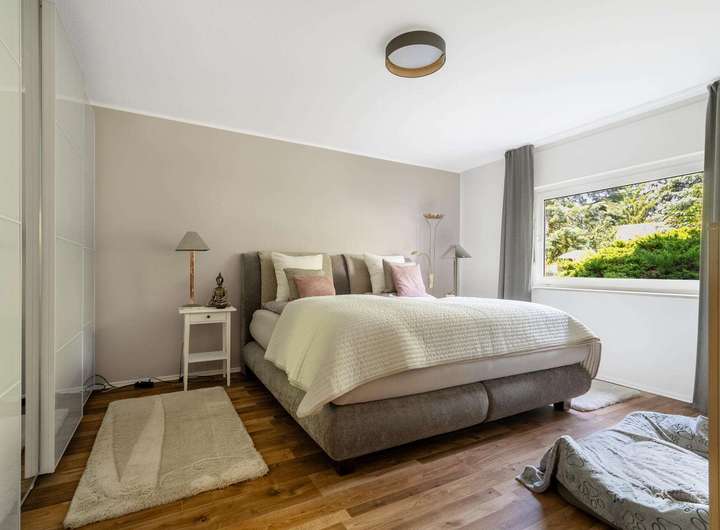 Über eine elegante Holztreppe erreicht man die zweite Etage, die sich als separater Einliegerbereich nutzen lässt. Mit eigener Gegensprechanlage ausgestattet, bietet dieser Bereich eine hohe Unabhängigkeit. Zwei helle Schlafzimmer, die durch einen komfortablen Ankleidebereich verbunden sind, schaffen Rückzugsmöglichkeiten für die ganze Familie. Auch hier stehen ein gefliestes Badezimmer mit Wanne und Dusche, eine voll ausgestattete Küche mit Elektrogeräten sowie ein gemütliches Wohnzimmer mit eigenem Balkon zur Verfügung – ein perfekter Ort für entspannte Stunden an der frischen Luft.