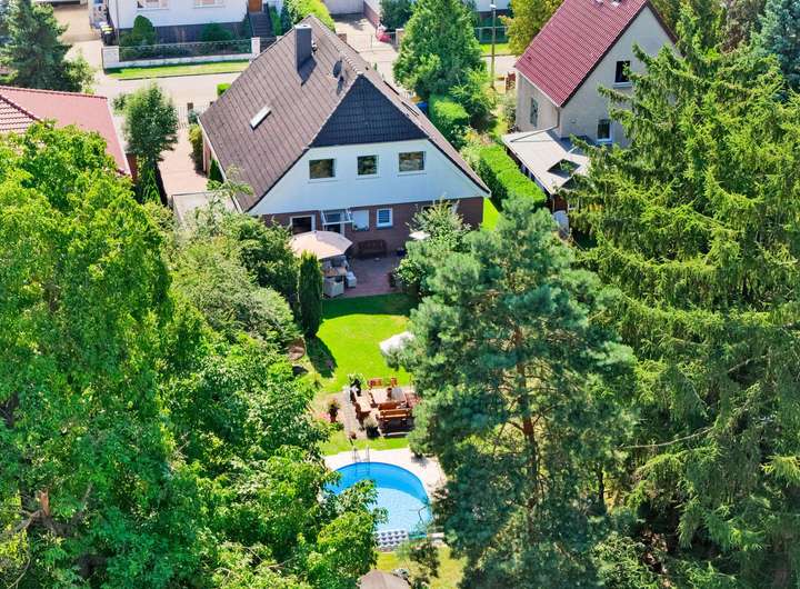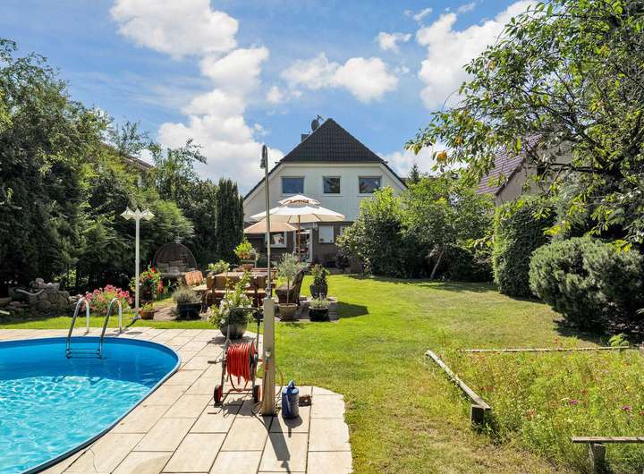 Dieses charmante und äußerst großzügige Einfamilienhaus im begehrten Ortsteil Alt-Karow erstreckt sich über eine Wohnfläche von ca. 232 m² und vereint Komfort, Funktionalität und ein hohes Maß an Wohnqualität. Mit seiner durchdachten Raumaufteilung über zwei Etagen sowie dem weitläufigen Garten mit Pool bietet es ideale Voraussetzungen für Familien und Menschen, die Wert auf viel Platz, Individualität und ein naturnahes Wohnerlebnis legen.