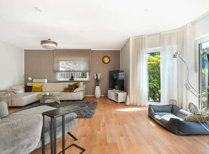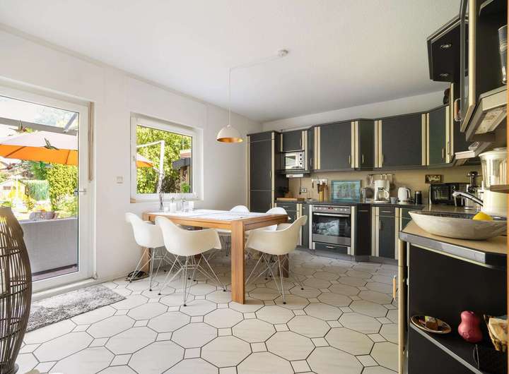 Die hellen Räume der Etage sorgen für ein besonders freundliches Wohngefühl. Ergänzt wird diese Ebene durch ein großzügiges Tageslichtbad mit Badewanne und Dusche, ein gemütliches Schlafzimmer sowie eine separate Küche mit Einbauküche inklusive Elektrogeräten. Von hier aus gelangt man auf die sonnige Terrasse und in den Garten – ideal, um die Zeit im Freien zu genießen. Zusätzlich befindet sich auf dieser Etage ein praktisches Gäste-WC, das für zusätzlichen Komfort sorgt. Zwei praktische Abstellräume runden das Raumangebot dieser Etage ab.