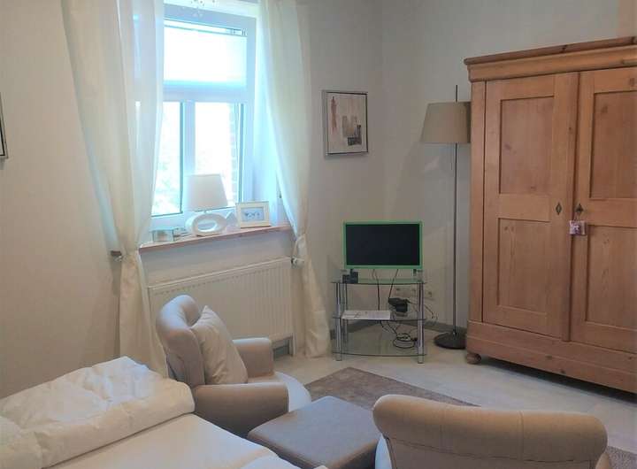 Das Obergeschoss beherbergt eine vollständig ausgestattete Ferienwohnung mit ca. 75 m². Zwei Schlafzimmer, Wohnzimmer, Küche, Bad, Gäste-WC und ein Balkon bieten hier ideale Voraussetzungen für Gäste, Familienmitglieder oder eine lukrative Vermietung.