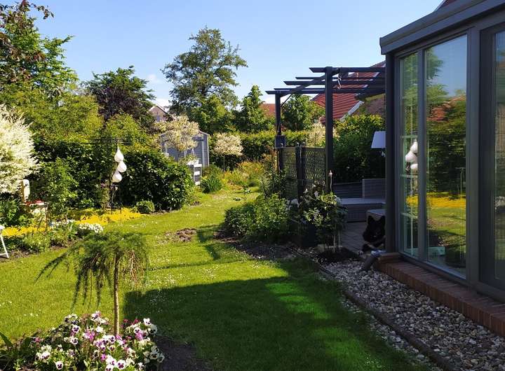 Das ca. 860 m² große Grundstück ist ein wahres Refugium. Der eingezäunte, uneinsehbare Garten ist liebevoll in zwei Bereiche gegliedert – ideal für Erholung, Spiel und Rückzug. Zwei Terrassen, eine Pergola, eine gemütliche Grillterrasse sowie der parkähnliche Bewuchs lassen jeden Sommertag zum Erlebnis werden. Eine massiv gebaute Garage mit Lager-/Geräteraum sowie 2 PKW-Stellplätze runden das Außenkonzept ab.