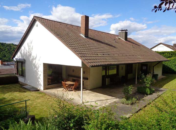 Die Aufteilung: Über eine Außentreppe gelangt man an den Hauseingang. Hier kommt man von einem Flur am Gäste- WC vorbei in den großzügigen Eingangsbereich. So befindet sich im rechten Bereich des Hauses das Wohnzimmer mit großem Panoramafenster, das Esszimmer sowie die Küche mit kleiner Abstellkammer. Im linken Bereich des Hauses gibt es zwei Schlafzimmer sowie das helle Tageslichtbad mit begehbarer Dusche. Vom Esszimmer, der Küche sowie von einem Schlafzimmer kommt man auf die große überdachte Terrasse mit direktem Zugang zum Garten.