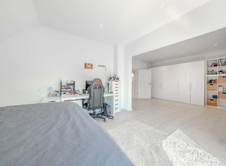 Die separate Einliegerwohnung verfügt über einen eigenen Eingang und bietet auf zwei Etagen einen komfortablen Wohnbereich mit moderner Nobilia-Küche, Wohnzimmer, Abstellraum und Badezimmer im Erdgeschoss. Das Obergeschoss ist mit einem geräumigen Schlafzimmer, einem Ankleidezimmer/Kinderzimmer und einem weiteren Badezimmer ausgestattet.
