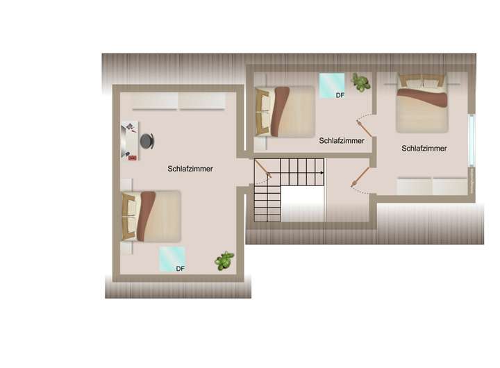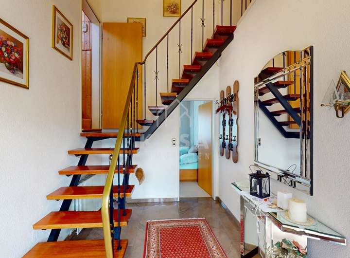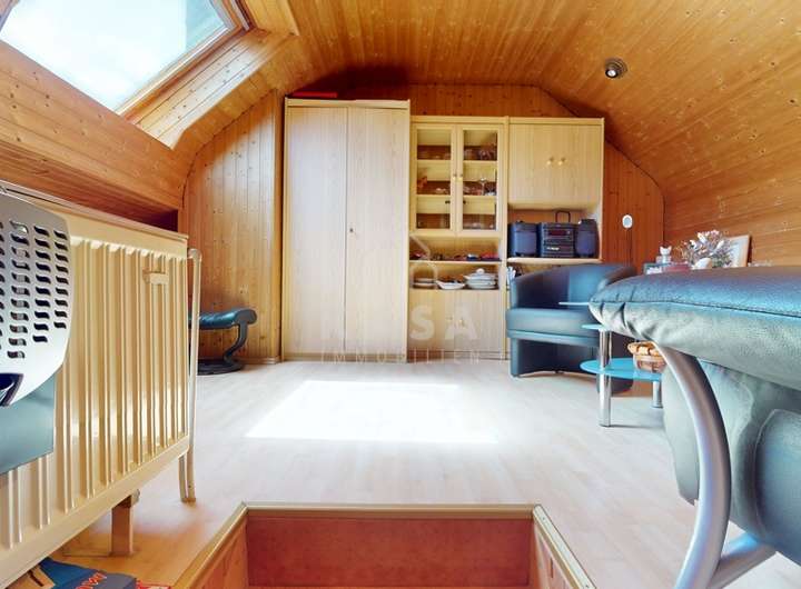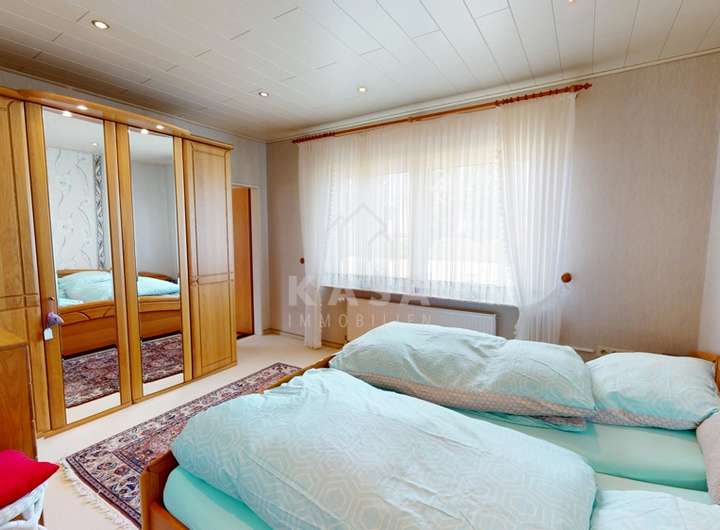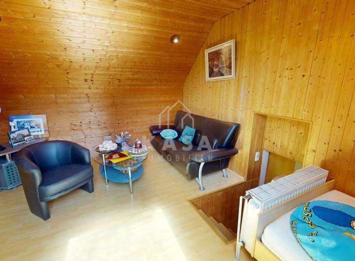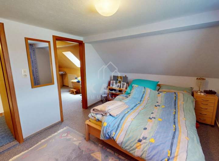 Ein weiteres Zimmer – ideal als Kinder- oder Arbeitszimmer – liegt auf halber Ebene. Über eine gepflegte Holz-Stahl-Treppe gelangt man ins Dachgeschoss, wo sich zwei weitere Schlafräume befinden, die als Durchgangszimmer angeordnet sind. Das Dach wurde vor etwa 20 Jahren vollständig erneuert, inklusive neuer Dachrinnen. Zudem wurden zahlreiche Fenster in den Jahren 2016 und 2018 erneuert, was zur Werterhaltung und zum Wohnkomfort beiträgt.