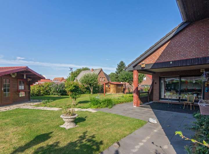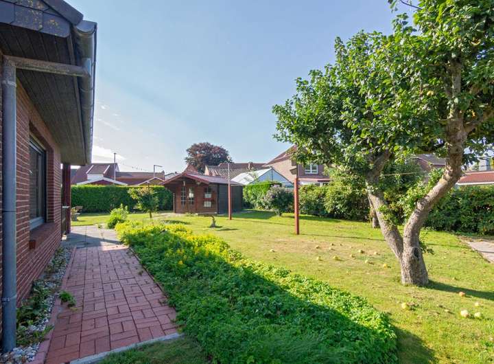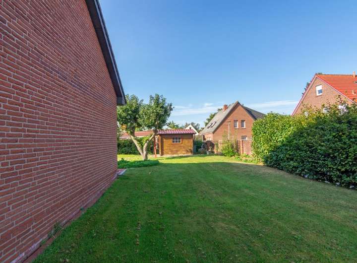 Das ca. 752 m² große Grundstück ist gepflegt angelegt und bietet neben einer Rasenfläche auch ein Gartenhäuschen.