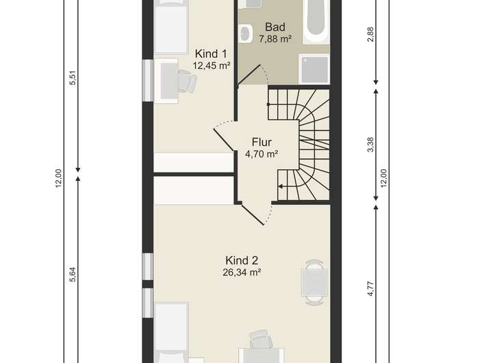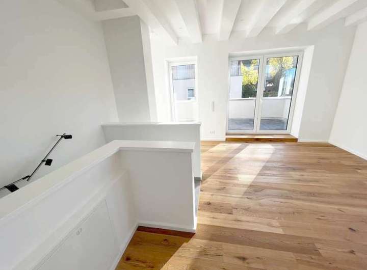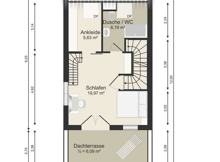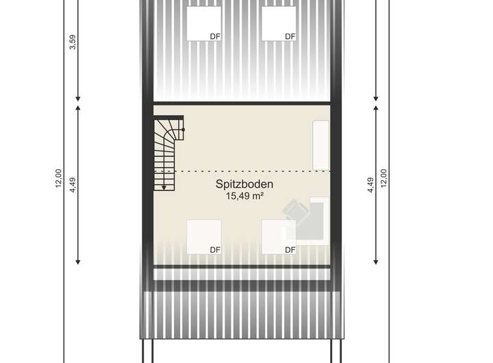 Interessant ist jedoch das Dachgeschoss mit einer hausbreiten Dachterrasse von ca. 12,58 m² und einem offenen Studio.