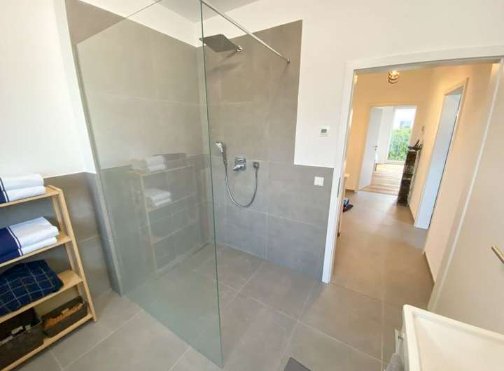 Zu der massiven Bauweise mit hochwertigen Designerelementen in Bädern und weiteren Ausstattungsmerkmalen gehört noch eine massiv erstellte Innentreppe, Fußbodenheizung und ein Kaminzug.