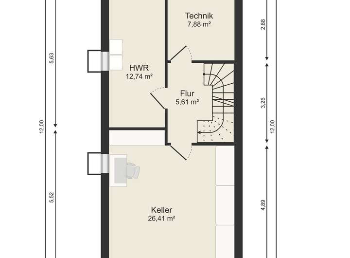 Das Untergeschoß hat Wohnraumhöhe und ebenfalls Fußbodenheizung.