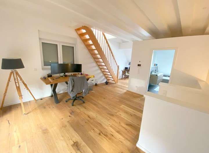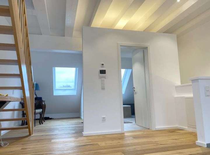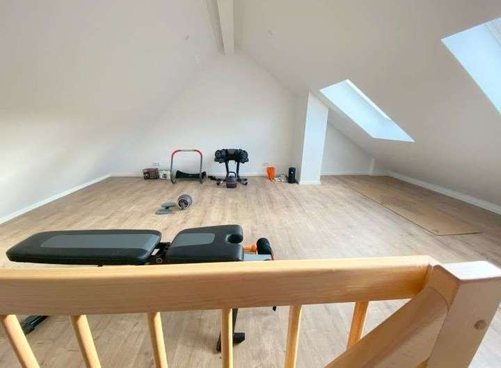 Darüber hinaus befindet sich dort ein großzügiger Luftraum mit einer Treppe auf eine Galerie in den Spitzboden.