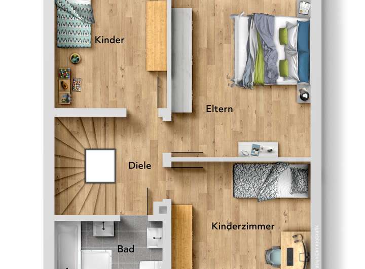 • Obergeschoss: Elternschlafzimmer, Kinderzimmer mit Zugang zum Südbalkon, Badezimmer mit Badewanne, Doppelwaschbecken, WC; weiteres Kinderzimmer