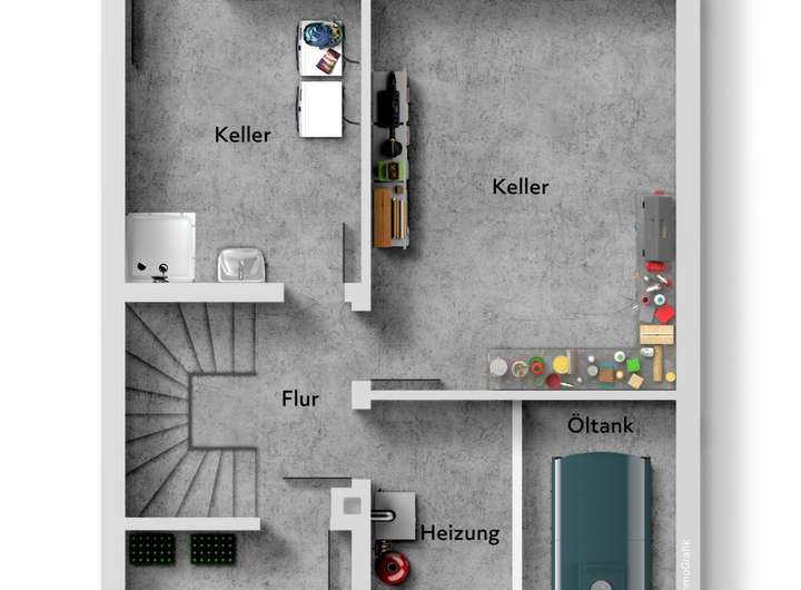 • Keller: Vorratsraum, Haushaltsraum, Werkstatt/Abstellraum, Heizungsraum samt Öltanks