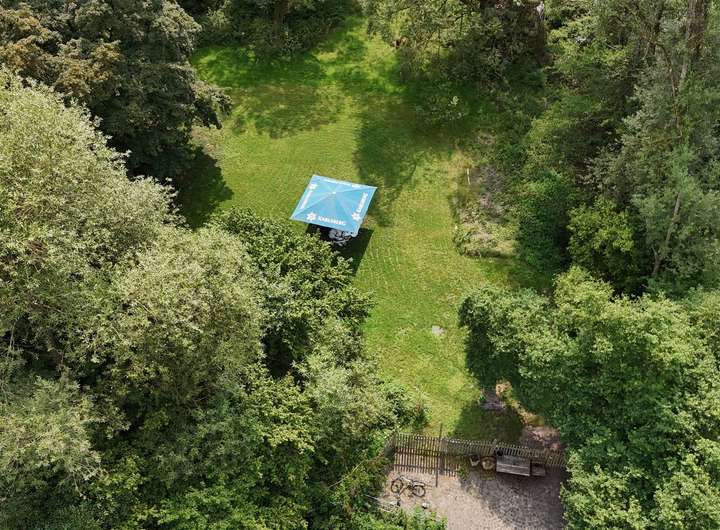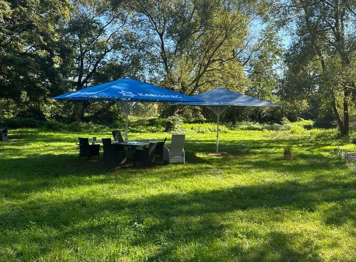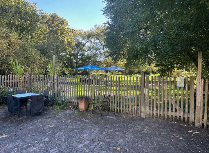 Auf dem etwa 8.000 qm großen eingezäunten Grundstück befindet sich ein Wiesengarten, der als Biergarten angelegt werden kann. Es sind hier Wasser- und Stromanschlüsse vorhanden.
