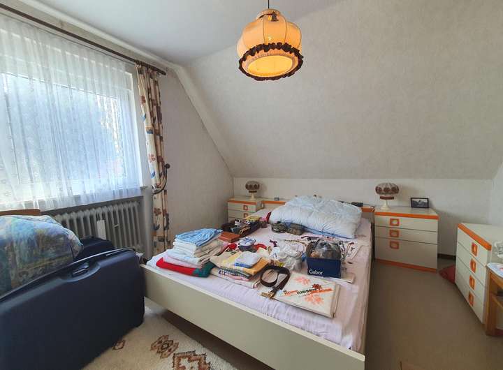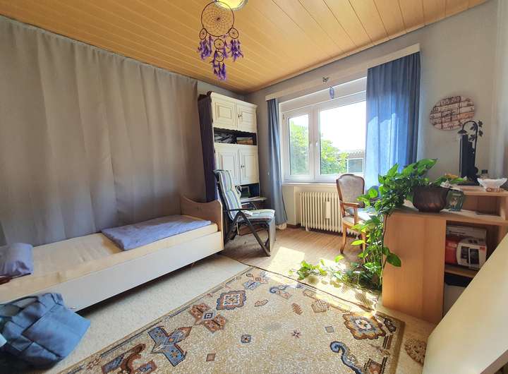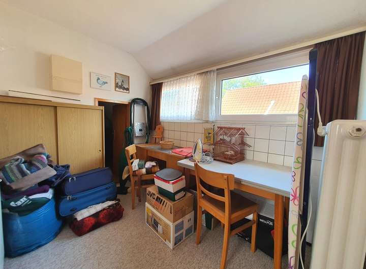 Im Dachgeschoss befinden sich zwei Schlafzimmer, ein Durchgangszimmer zum Bad, welches sich ideal als Büro oder Ankleidezimmer eignet, sowie das sanierungsbedürftige Tageslichtbad.