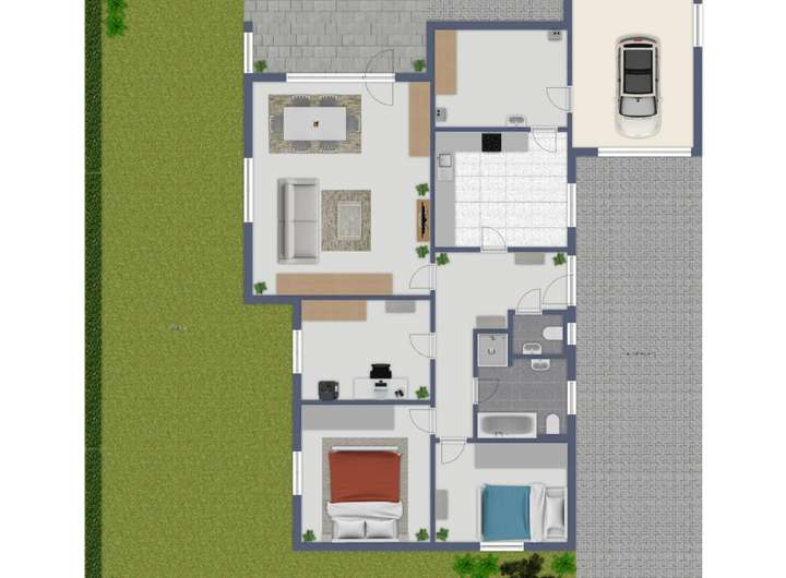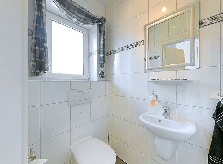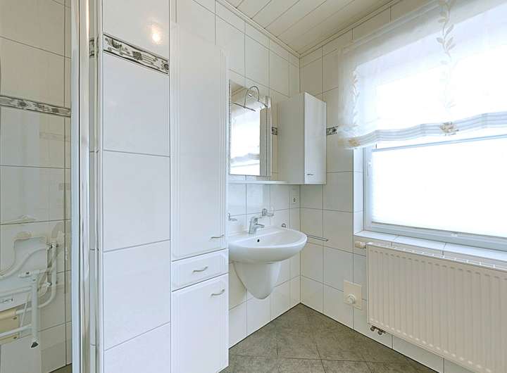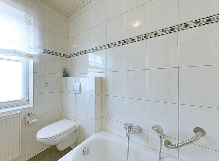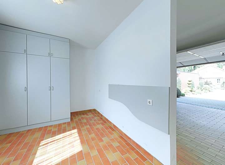 Das Tageslichtbadezimmer verfügt sowohl über eine Badewanne als auch über eine ebenerdige Dusche. Zusätzlich steht Ihnen ein praktisches Gäste-WC zur Verfügung. Ein Hauswirtschaftsraum, welcher die Küche und die Garage verbindet rundet den funktionalen Grundriss ab. Die Garage ist mit einem elektrischen Rolltor ausgestattet und bietet neben dem Platz für einen PKW zusätzlichen Stauraum.