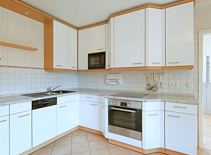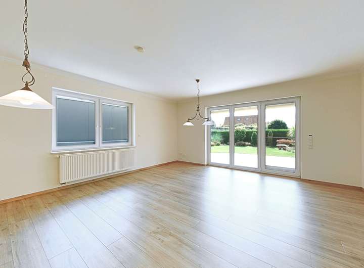 Das helle Wohnzimmer bietet direkten Zugang zur überdachten Terrasse, auf der Sie entspannte Stunden im Freien genießen können. Große Fenster mit Außenjalousien sorgen für angenehmes Licht und ein behagliches Wohngefühl. Die separate Küche ist mit einer modernen Einbauküche ausgestattet und lädt zum Kochen und Verweilen ein.