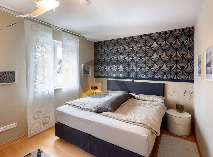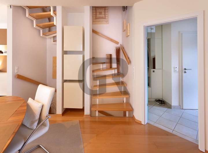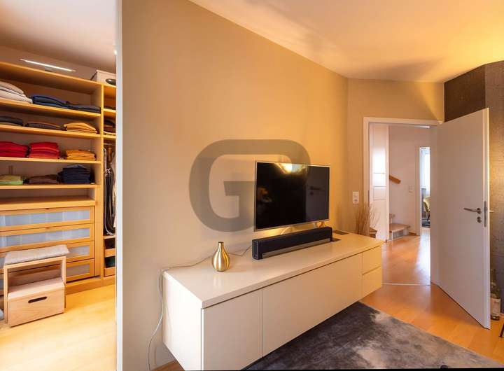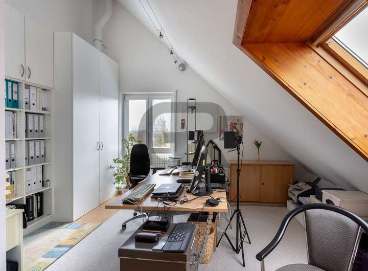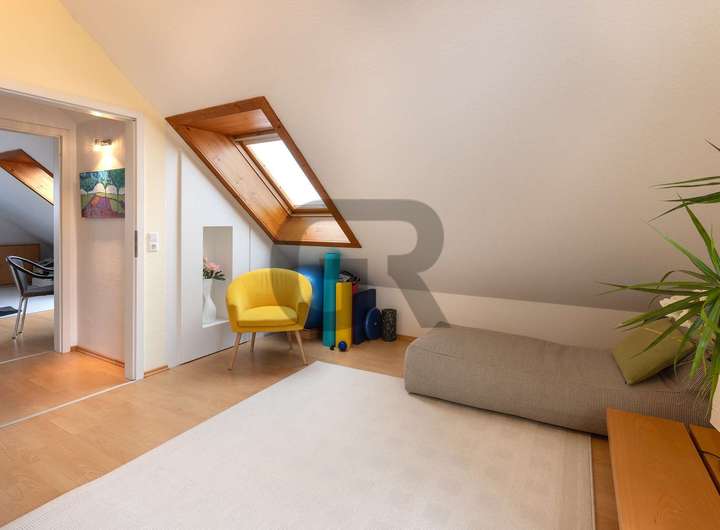 Im ersten Obergeschoss erwartet Sie ein stilvoll gestalteter Elternbereich mit Designertapeten, Ankleide und modernem Tageslichtbad sowie ein weiteres großzügiges Zimmer, das als Kinder-, Gäste- oder Arbeitszimmer genutzt werden kann. Im Dachgeschoss stehen zwei weitere helle Räume zur Verfügung, perfekt für Kinder, Gäste oder als Rückzugsorte zum Arbeiten und Entspannen.