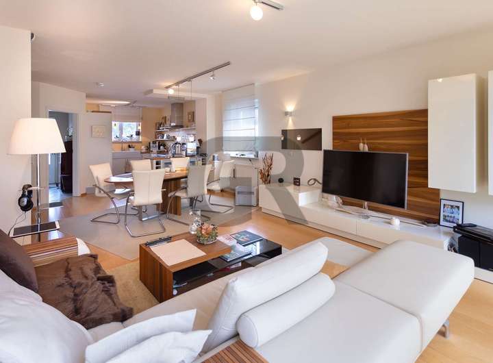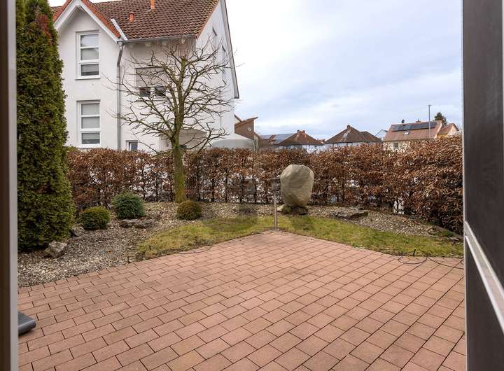 Der offene Wohn-Essbereich mit hochwertiger Einbauküche lädt ein zu geselligen Abenden oder entspannten Stunden allein. Von hier blicken Sie direkt in den pflegeleicht gestalteten Garten mit großzügiger Terrasse, computergesteuerter Bewässerung und Sonnenschutz durch die Markise – ideal für entspannte Stunden im Freien.