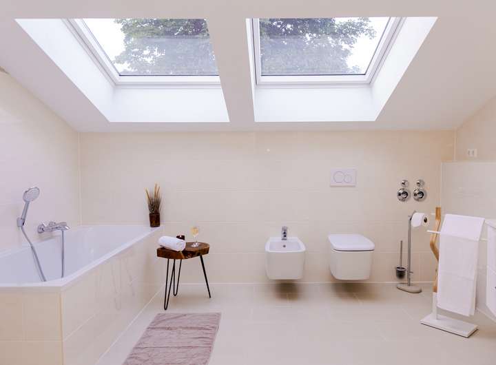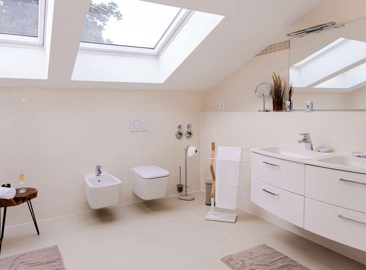 - sehr großzügiges Bad (sep. Wanne und Dusche + sep. Gäste-WC