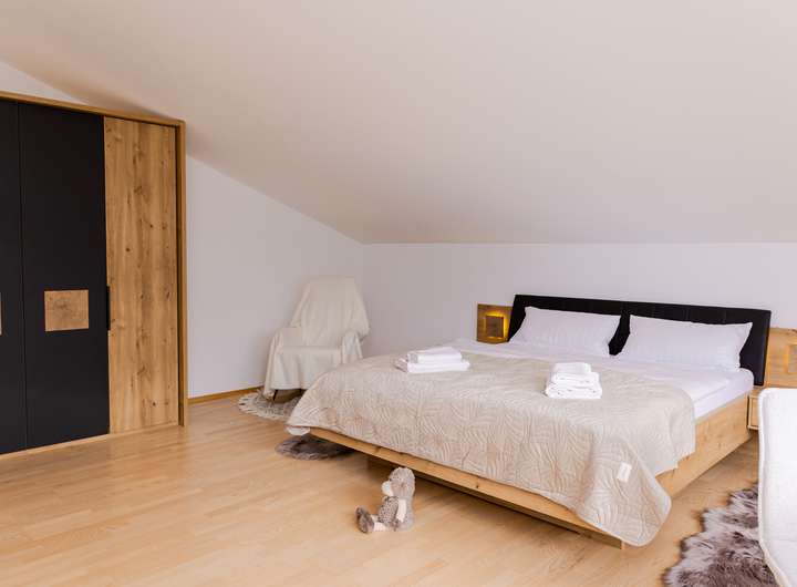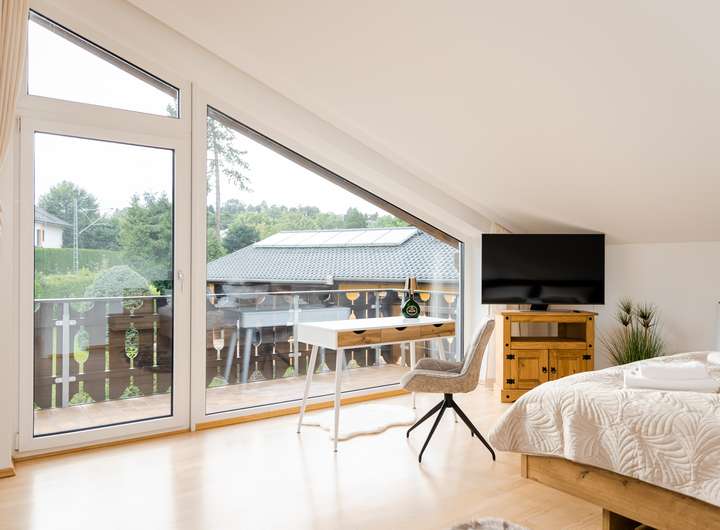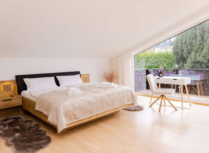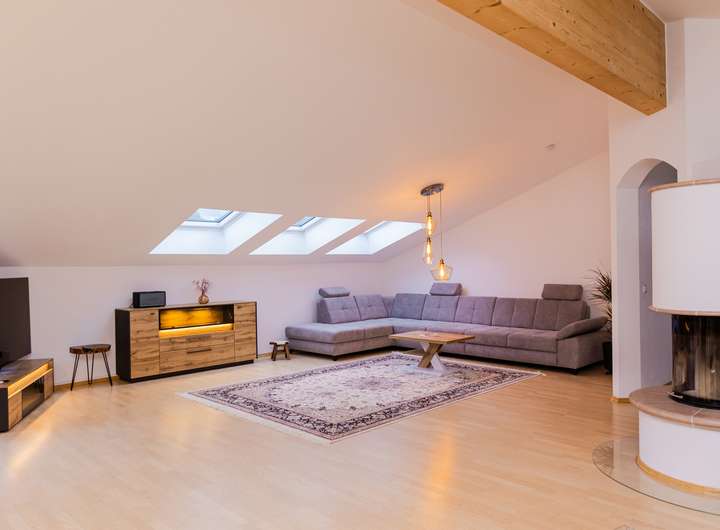 Die DG-Wohnung teilt sich auf in 2 Schlafzimmer mit Zugang zum Balkon und einen sehr großzügigen Wohn-/ Essbereich mit Dachterrasse und Bergblick.