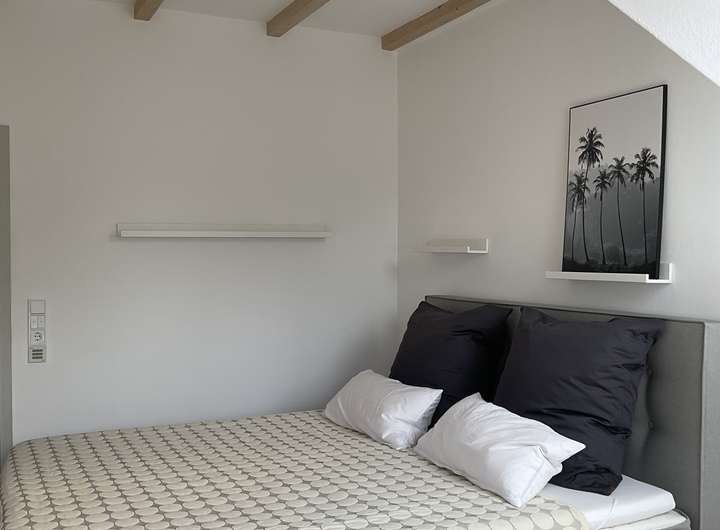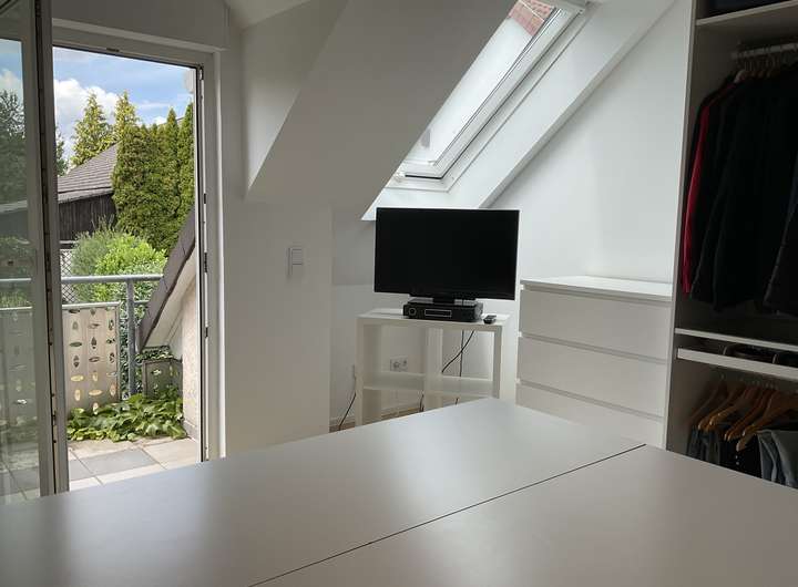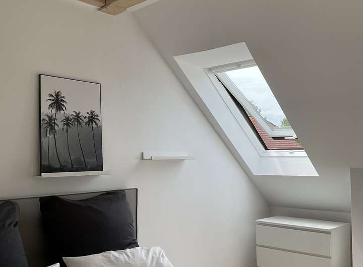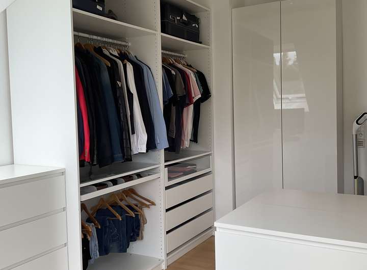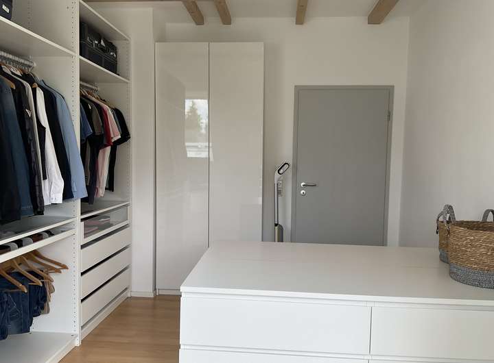 Im ausgebauten Dachgeschoss befindet sich zusätzlicher Stauraum mit maßgefertigten Regalen.