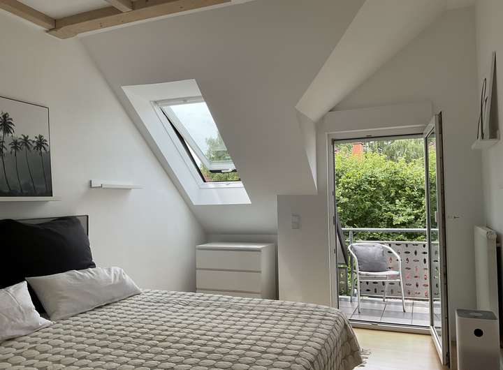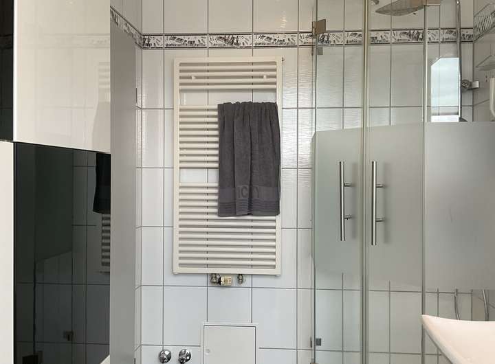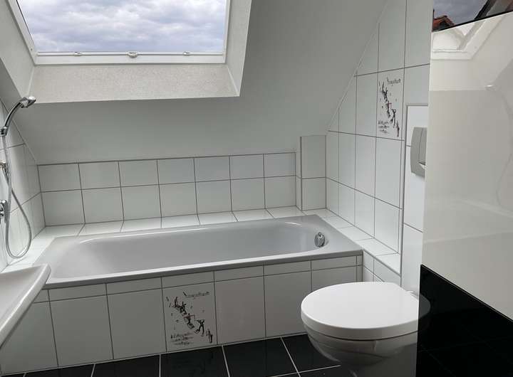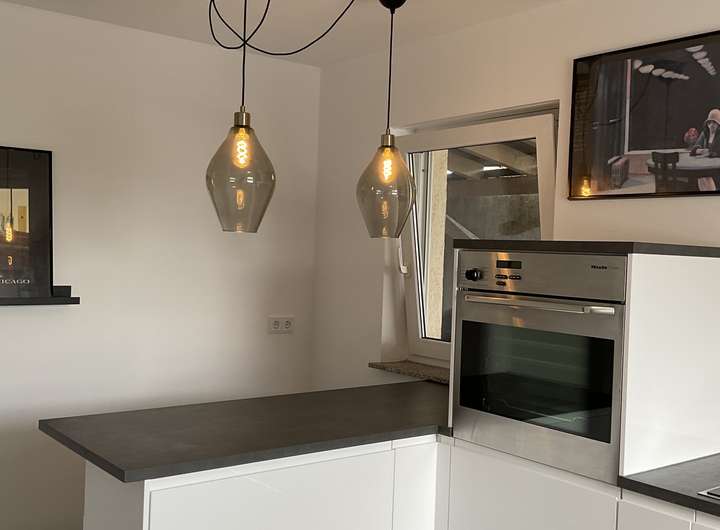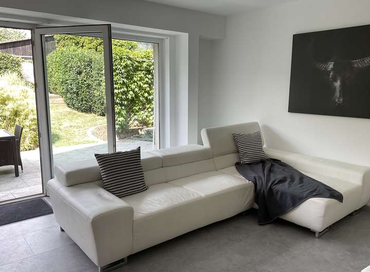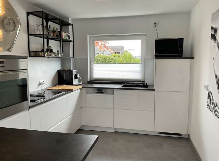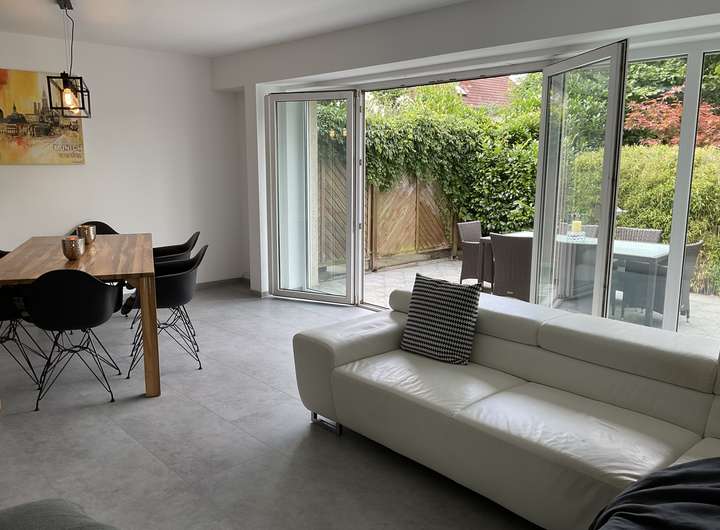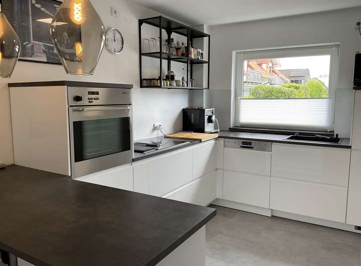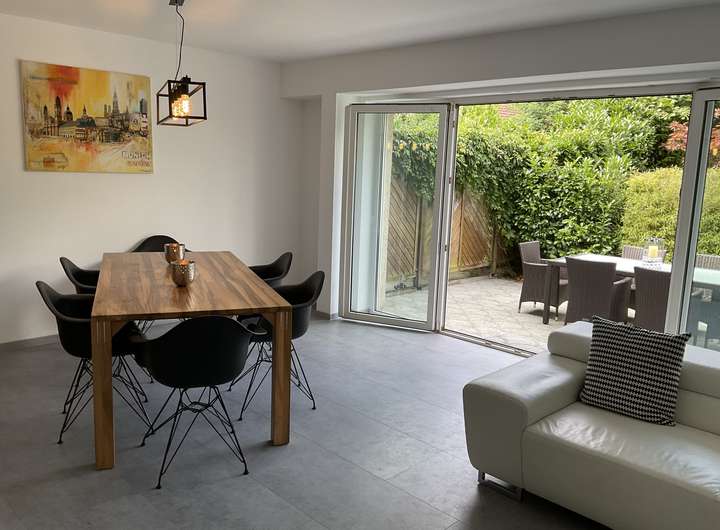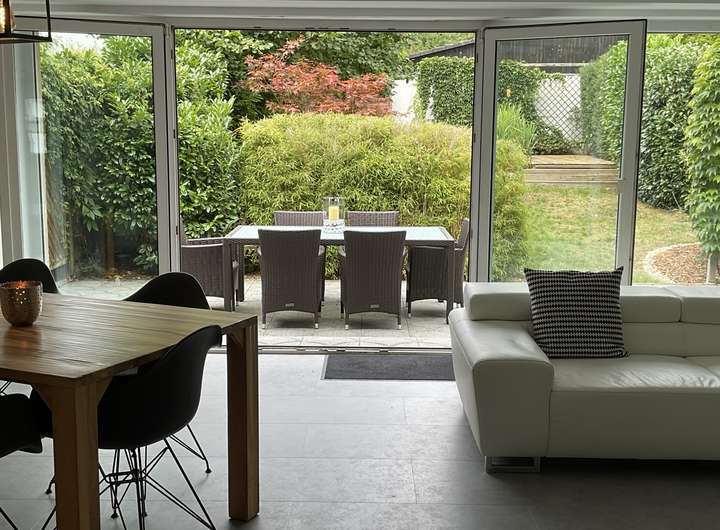 Im Erdgeschoss befinden sich ein großzügiger Wohn- und Essbereich mit Zugang zur 40 qm großen Terrasse und zum Garten, eine neuwertige separate Küche (Einbau 2023) sowie ein Gäste-WC mit Dusche.