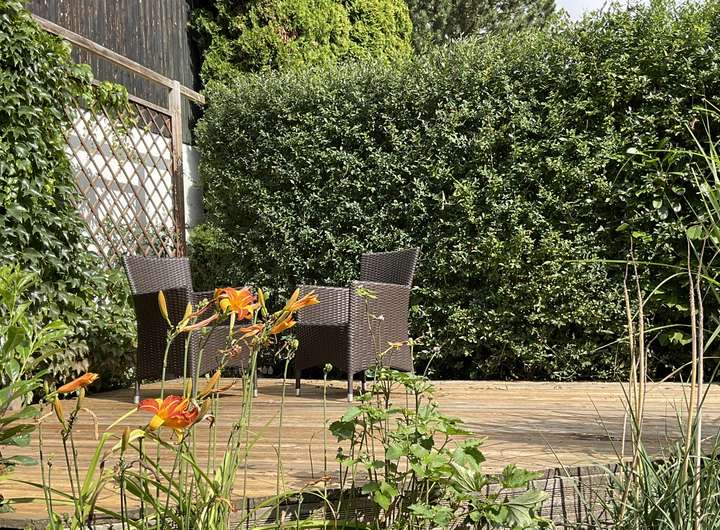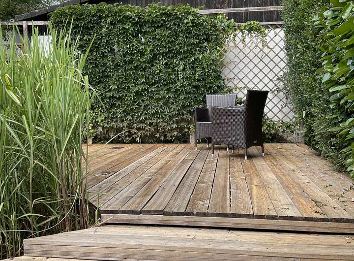 Im Garten befindet eine zweite Sonnenterasse in Holzbauweise.