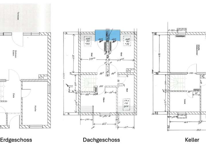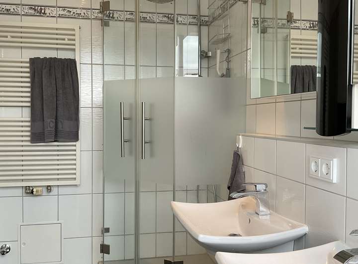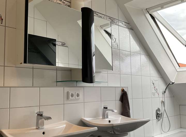 Das Obergeschoss bietet drei Schlafzimmer und ein Tageslichtbad mit Dusche und Badewanne.