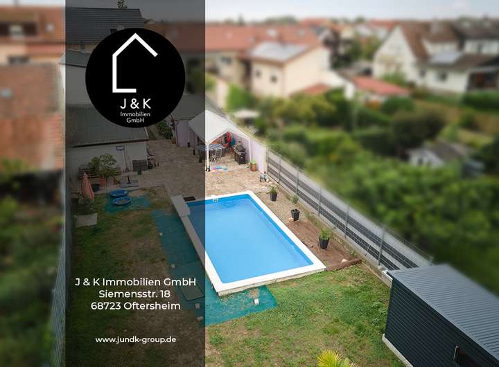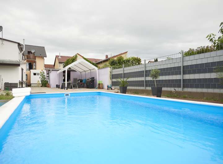 Ein moderner Salzwasserpool (8 × 4 × 1,5 m) mit vollautomatischer Elektrolyseanlage schenkt Urlaubsfeeling direkt vor der Haustür.
