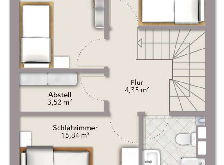OG: Schlafzimmer, 2 Kinderzimmer, Badezimmer, Abstellraum und Flur.