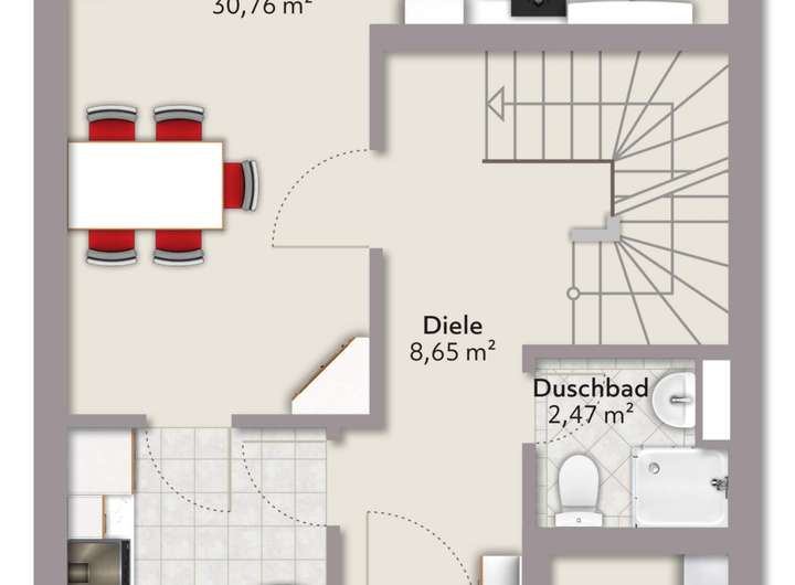 EG: Wohn-/Esszimmer, Küche, Gäste-Duschbad, Abstellraum, Flur und Windfang.