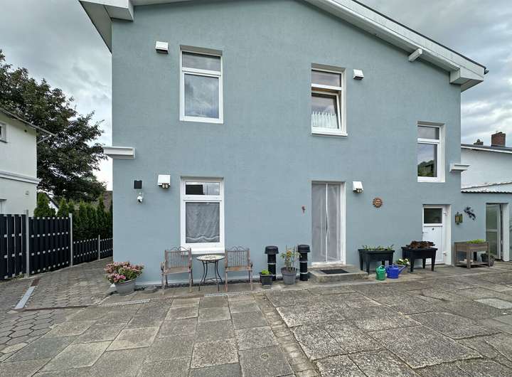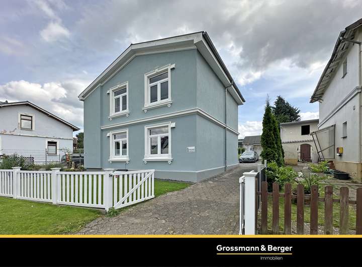 Dieses gepflegte Zweifamilienhaus wurde im Jahr 1900 errichtet. Die hellblau verputzte Fassade mit weißen Akzenten und einer dekorativen Zierleiste verleiht dem Gebäude ein einladendes und stilvolles Erscheinungsbild.