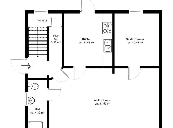 Das Tageslichtbad ist funktional gestaltet und bietet ausreichend Platz. Die Küchen sind hell und praktisch geschnitten. Ein Fenster sorgt hier nicht nur für gute Belüftung, sondern auch für eine freundliche Atmosphäre. Komplettiert werden die Wohnungen durch ein großzügiges Schlafzimmer. Die Obergeschosswohnung empfängt Sie mit einem kleinen Flur inklusive Garderobe.