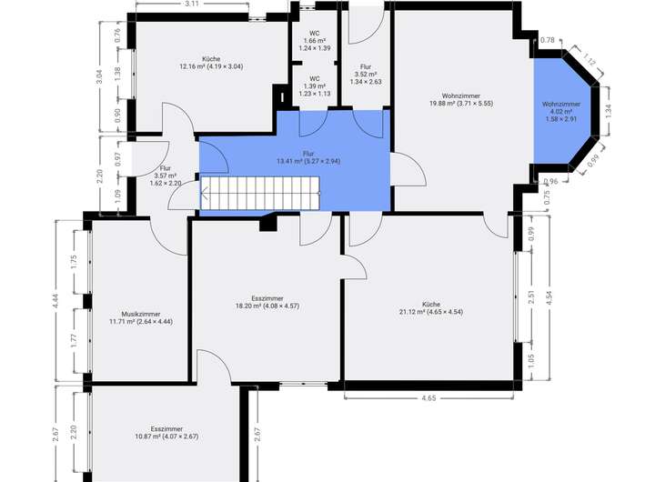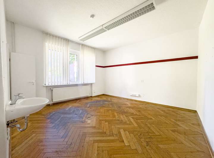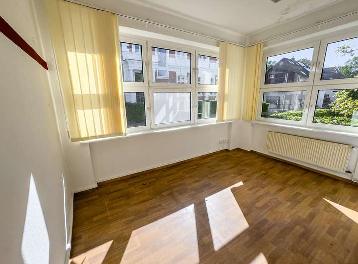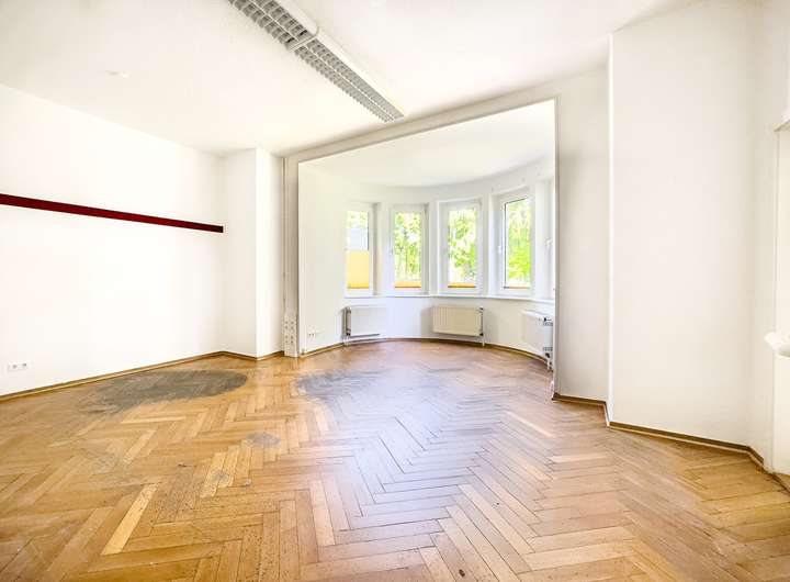 Auf vier Etagen verteilen sich insgesamt 12 Räume – eine beeindruckende Vielfalt, die zahlreiche Nutzungskonzepte zulässt. Großzügige, lichtdurchflutete Zimmer mit teils originalem Fischgrätparkett eignen sich ideal als repräsentative Kanzlei, stilvolles Büro oder moderne Arztpraxis. Das Erdgeschoss mit ca. 100 m² Fläche könnte gewerblich oder für Wohngenutzt werden, während die oberen Etagen als private Wohnräume oder separate Einheiten dienen könnten. Die nötigen Anschlüsse für Bäder und Küchen sind vorhanden, bedürfen jedoch einer zeitgemäßen Erneuerung.