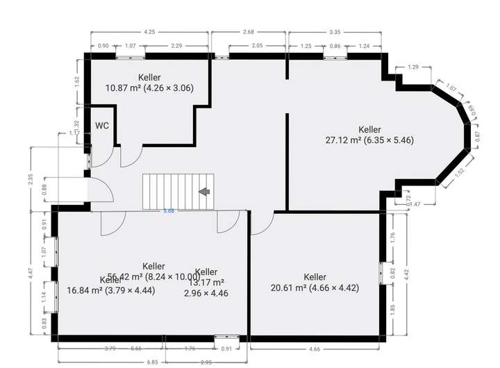 Ein weiteres Highlight ist das ungewöhnlich großzügige Kellergeschoss: Viel Platz für Lager, Werkstatt, oder Ausbau – selten in dieser Form und Ausdruck des besonderen Charakters der Villa. Charmante architektonische Details wie der runde Erker und der Balkon im Erdgeschoss verleihen dem Haus zusätzliche Ausstrahlung und historischen Reiz.