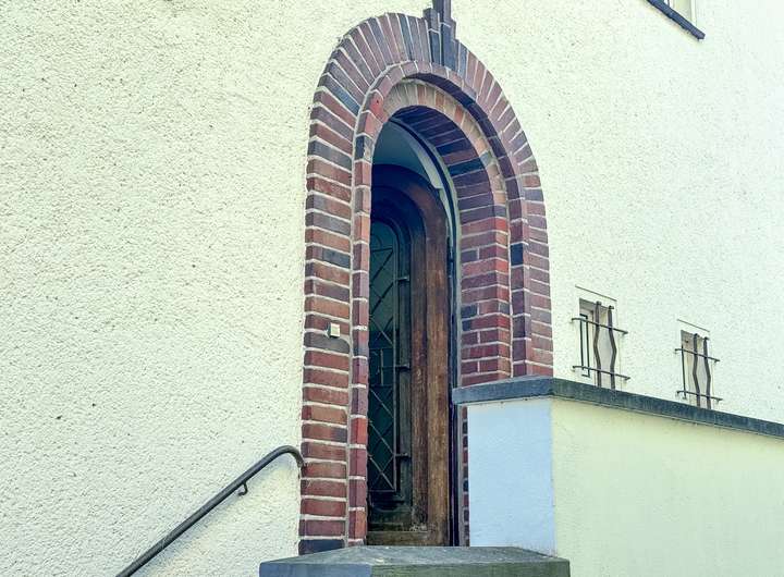 // Architektonische Details wie der gemauerte Rundbogen am Eingang, eine schwere Holztür, freigelegtes Balkenwerk, ein runder Erker sowie ein Balkon im Erdgeschoss