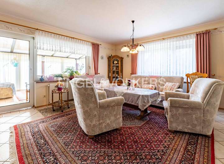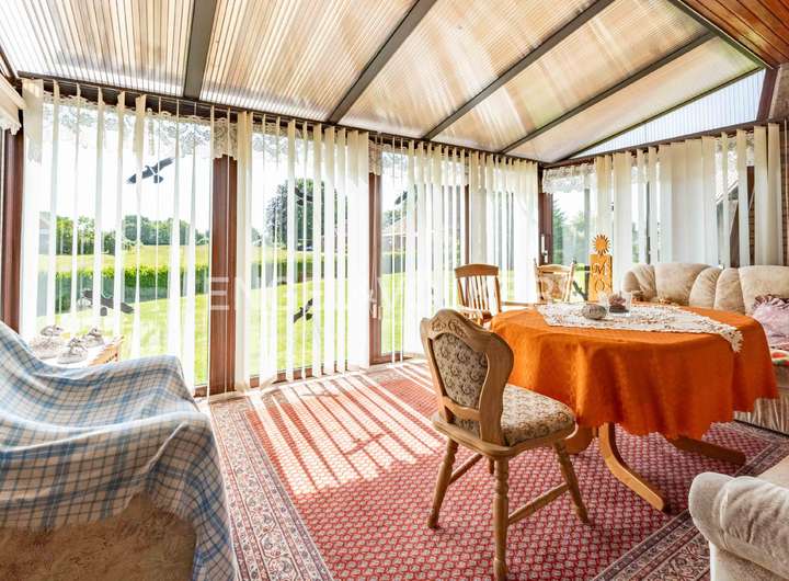 Im Erdgeschoss erwartet Sie ein gut durchdachter Grundriss mit einem Schlafzimmer, einem Ankleidezimmer, einem weitläufigen Wohnzimmer mit Zugang zum beheizten Wintergarten sowie einer großen Wohnküche, die zum geselligen Beisammensein einlädt. Drei Badezimmer sorgen für Komfort und Struktur im Alltag. Von der überdachten Terrasse aus genießen Sie den unverbauten Blick ins Grüne. Ein praktischer Übergang führt von der Waschküche mit Gäste-WC direkt in die Werkstatt, ein Lager und die großzügige Garage bzw. Scheune – ideal für handwerkliche Tätigkeiten, Lagerung oder Hobbyprojekte.