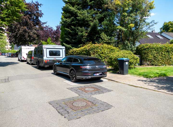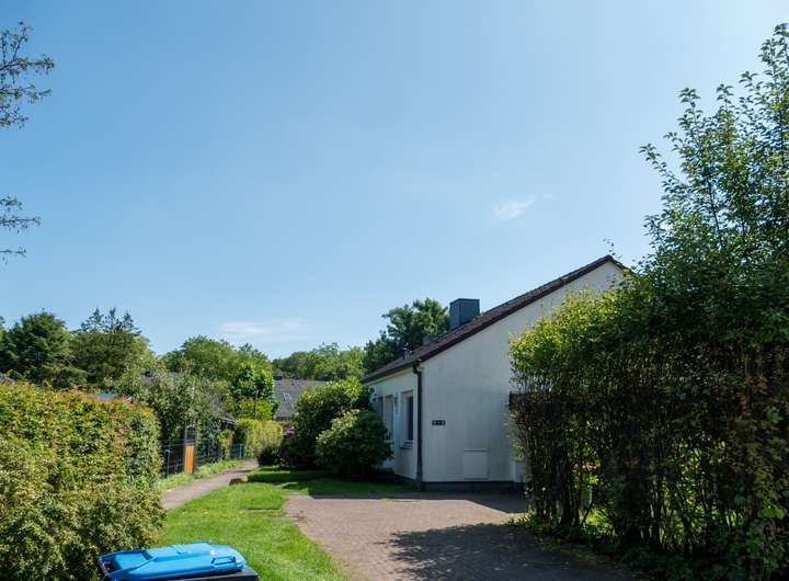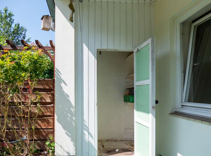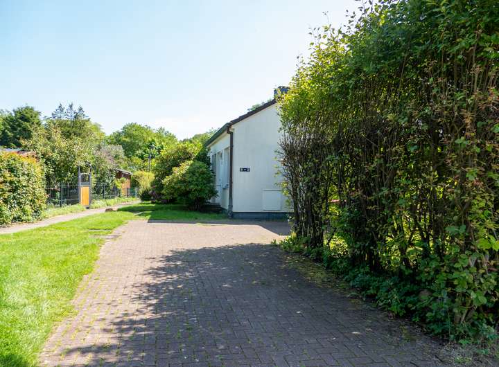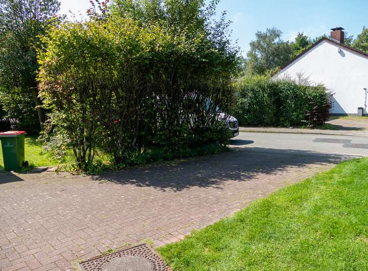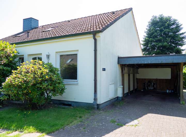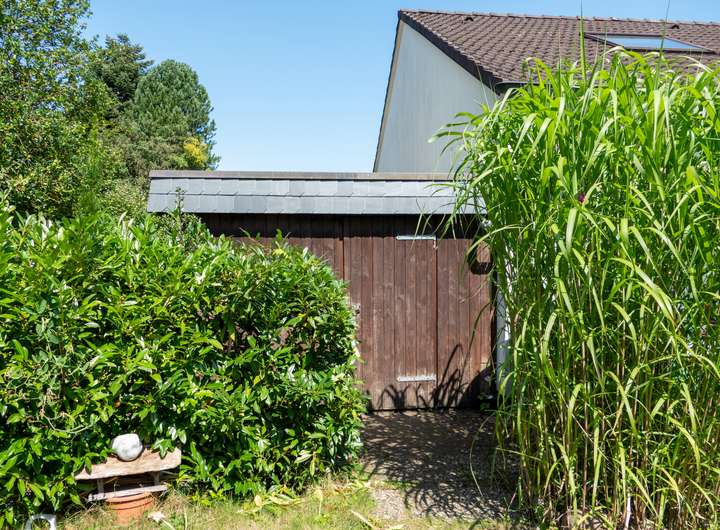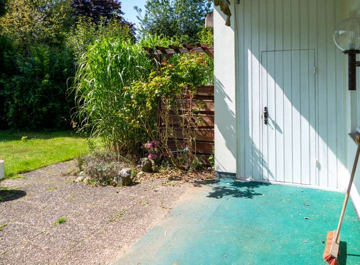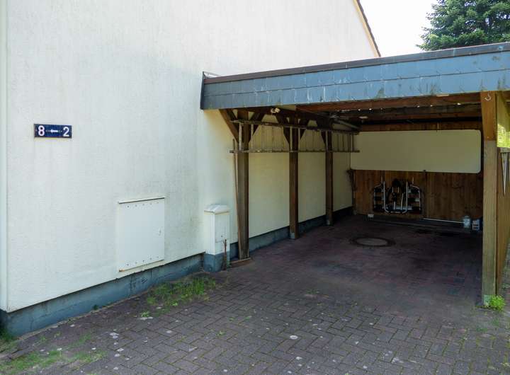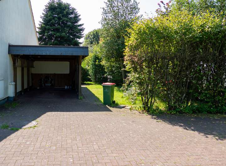 Seitlich vom Haus steht ein großes Carport mit Abstellfläche zur Verfügung. Der nebenliegende kleine Weg führt direkt zur Terrasse und auf das grüne Rasengrundstück.