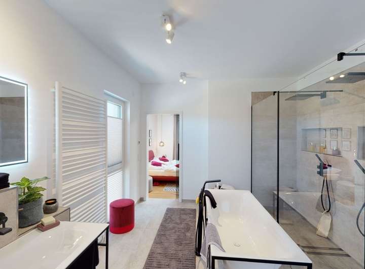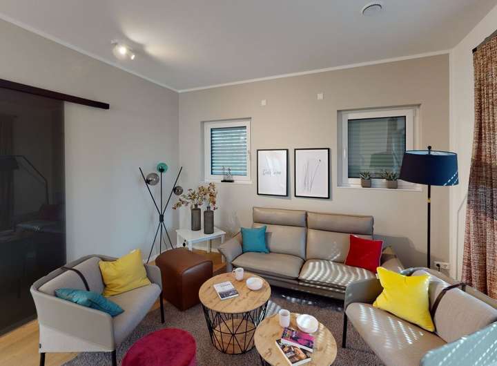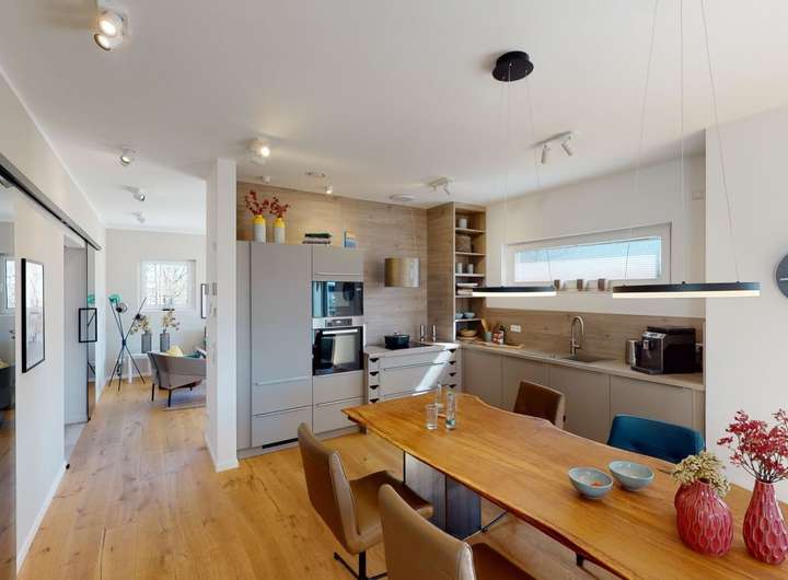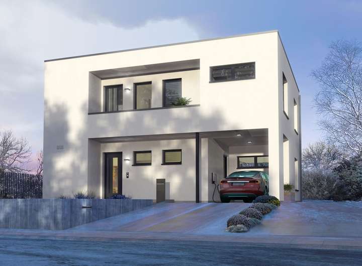 Die klare Struktur der zweigeschossigen Flachdachvilla wird durch die Rücksprünge in der Fassade und die asymmetrische Gestaltung architektonisch bereichert. Praktisch und ideal für kleinere Grundstücke ist der integrierte Carport. Auch im Innenbereich setzt sich der schlichte, helle und komfortable Stil fort. Das Erdgeschoss ist deutlich in Nutz-, Wohn- und Essbereich mit offener Küche unterteilt. Eine halbgewendelte Treppe führt zur oberen Etage. Dort befindet sich das Elternschlafzimmer mit einem großzügigen Bad sowie Zugang zur eigenen Loggia, die vom Bereich der Kinder mit Dusche/WC abgetrennt ist. Die verschiedenen Bereiche werden durch die lichtdurchflutete Galerie verbunden, die ebenfalls zu einer weiteren Loggia führt. Hier fühlt man sich rundum wohl.
