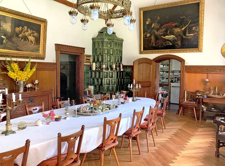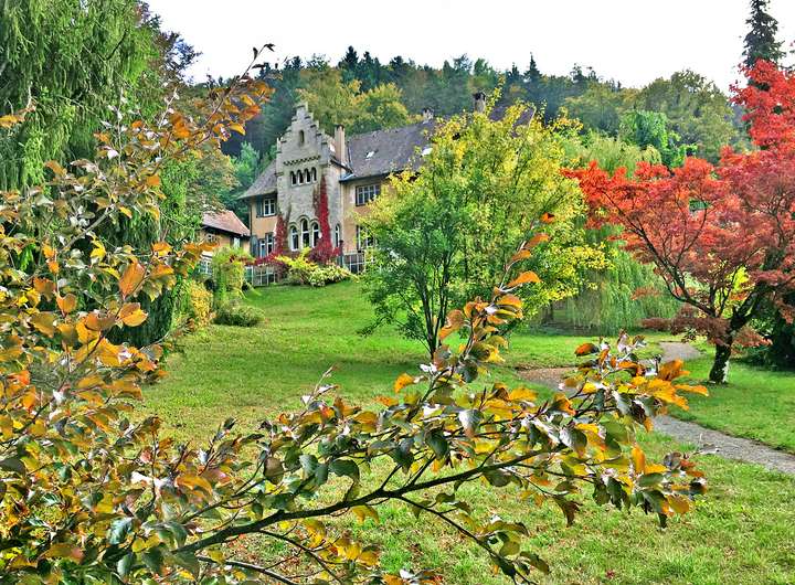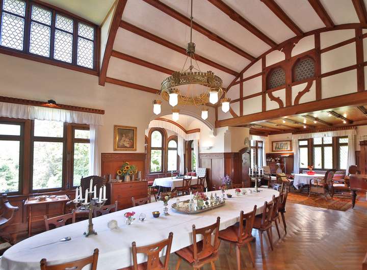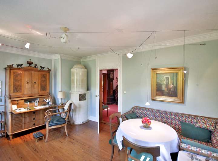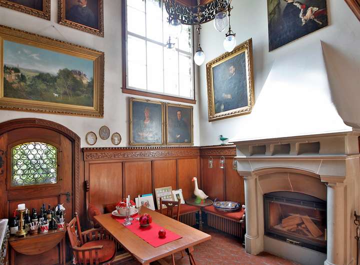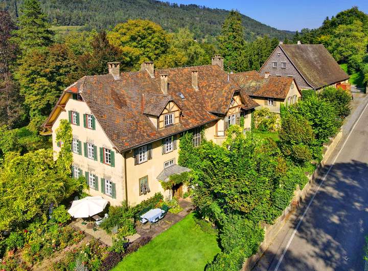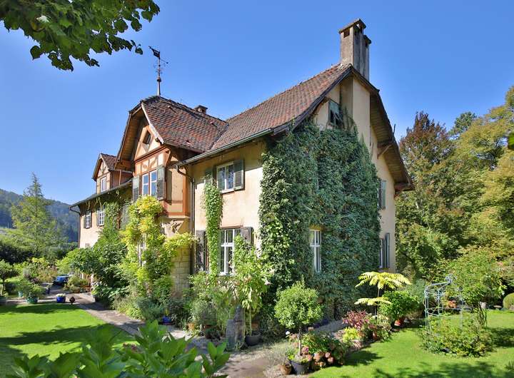 Die historische Villa mit 551 m² Wohnfläche verzaubert durch ihren eleganten Charakter und zahlreiche liebevoll erhaltene Details. Hochwertiges Fischgrätparkett, edle Wandvertäfelungen, kunstvolle Stuckdecken und ein klassischer Kachelofen verleihen den Räumen eine besondere Wärme und Stil. Massive Holztüren und eine prächtige Holztreppe unterstreichen den ursprünglichen Charme des Hauses. Die großzügige Terrasse von 130 m² öffnet den Blick weit ins Tal, vermittelt mediterranes Flair und führt in einen idyllischen Park mit altem Baumbestand, Teich und eigener Quelle.