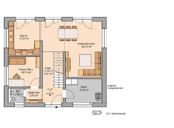 Gleich im Eingangsbereich zeigt die Stadtvilla Signus durch ihre Offenheit was sie zu bieten hat. Eine große Garderobe verstaut die Jacken und Mäntel der Bewohner sowie Besucher. Über einen langen Flur, vorbei an der geradläufigen Treppe, gelangen Sie in den Wohn-/Essbereich des Hauses, an den auch die offene Küche Anschluss findet. Von hier bieten die bodentiefen Fenster einen herrlichen Blick in den Garten. Des Weiteren befindet sich im Erdgeschoss ein Home-Office, das auch als Gäste-Zimmer genutzt werden kann, als auch ein Hauswirtschaftsraum und ein Gäste-WC.