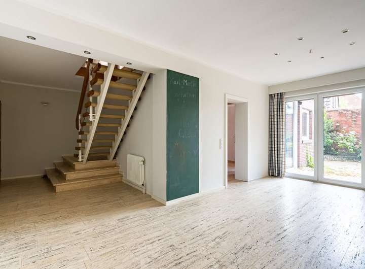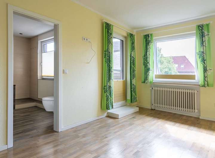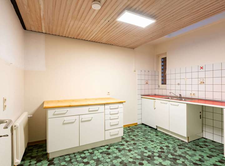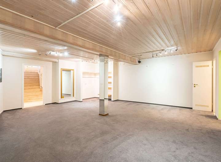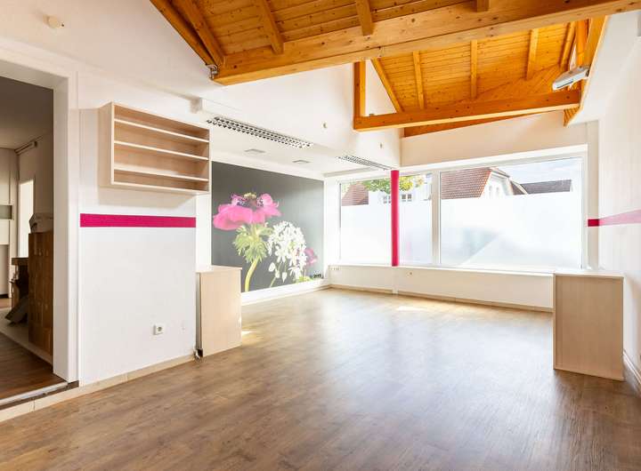 Das Erdgeschoss präsentiert sich zur Straße hin mit einer vielseitig nutzbaren Gewerbefläche, die durch ihre Lage und Sichtbarkeit ideale Voraussetzungen für unterschiedliche Nutzungskonzepte bietet. Im hinteren Teil des Hauses liegt der private Wohnbereich: Ein weitläufiges Wohnzimmer mit angrenzendem Essbereich schafft eine offene Wohnatmosphäre. Das gemütliche Kaminzimmer sorgt für besondere Wohlfühlmomente, während die separate Küche ausreichend Platz für die ganze Familie bereithält. Ergänzt wird das Erdgeschoss durch ein Gäste-Bad sowie einen praktischen Hauswirtschaftsraum.