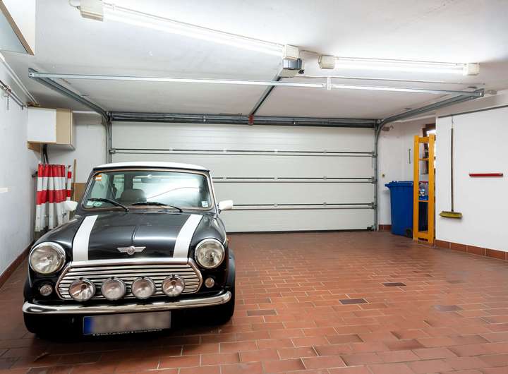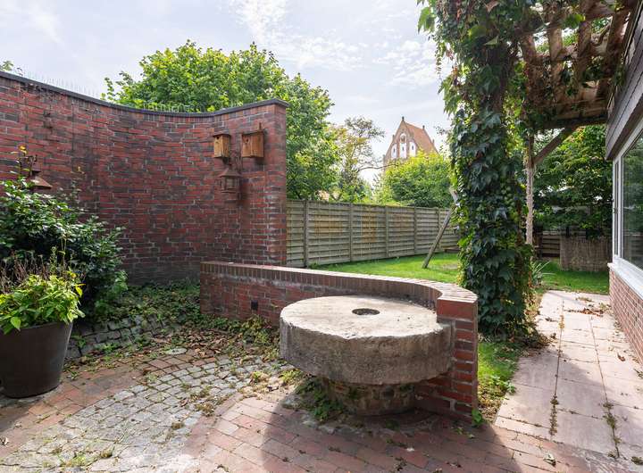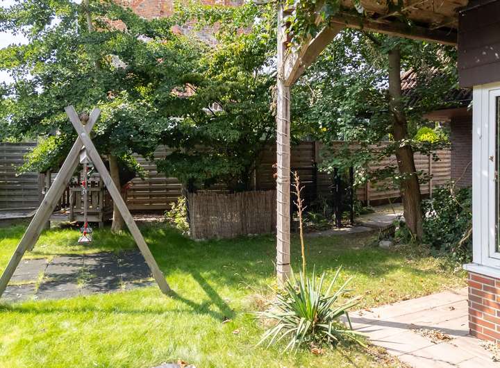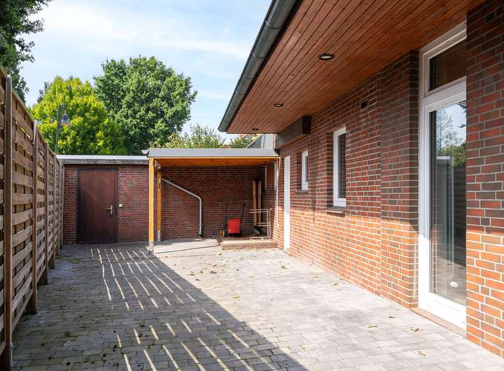 Der Garten ist vollständig eingefriedet, pflegeleicht angelegt und blickgeschützt. Eine großzügige Terrasse lädt zu entspannten Stunden im Freien ein. Für Fahrzeuge steht eine Doppelgarage mit elektrischem Tor zur Verfügung, die durch einen separaten Geräteschuppen ergänzt wird. Zusätzlich befinden sich auf dem Hof sieben Außenstellplätze, die ausreichend Platz für weitere Fahrzeuge bieten.