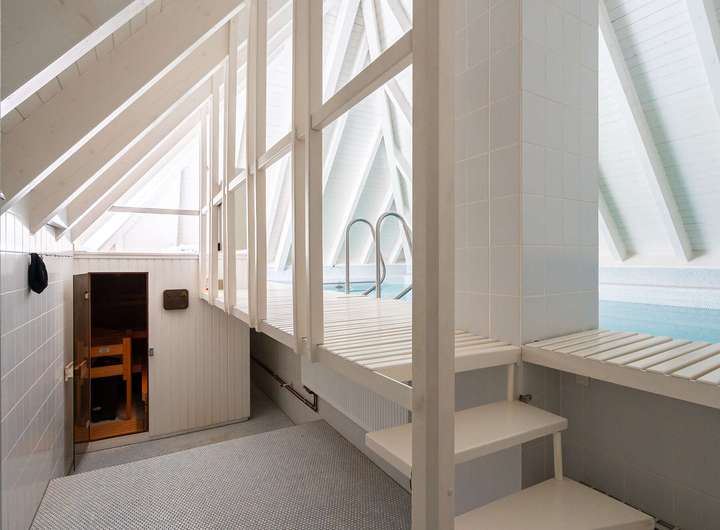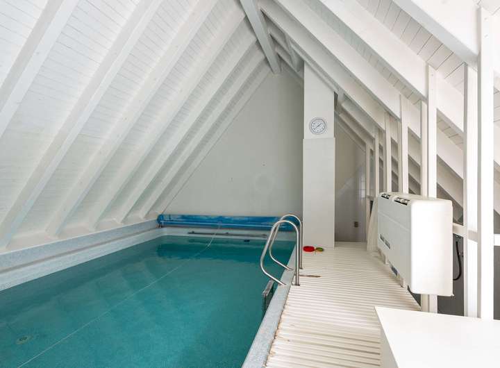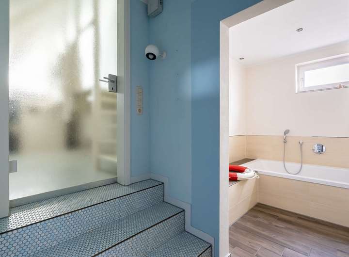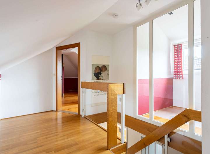 Im Obergeschoss stehen weitere Büroräume für die Gewerbeeinheit bereit. Der private Wohnbereich überzeugt hier mit einem großzügigen Elternschlafzimmer, das über ein modernes Bad en Suite und einen Zugang zum Balkon verfügt. Des Weiteren befindet sich auf dieser Etage das Kinderbad. Ein echtes Highlight ist der Pool- und Saunabereich, der eine besondere Wohlfühloase im eigenen Zuhause schafft.