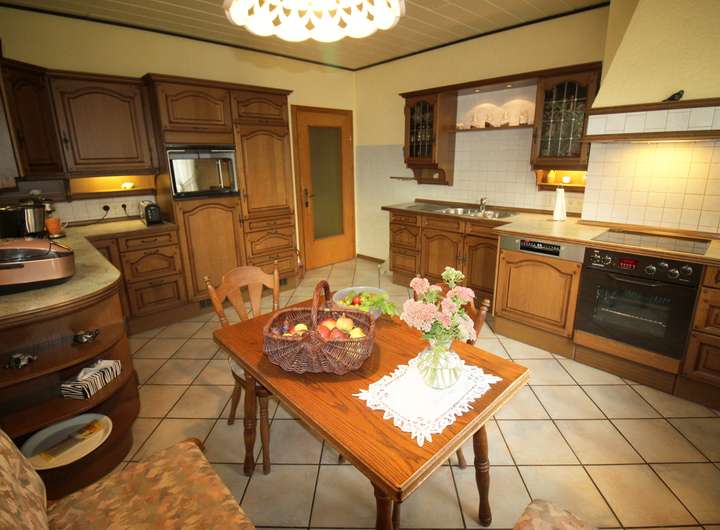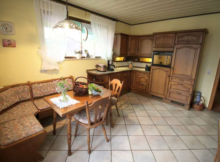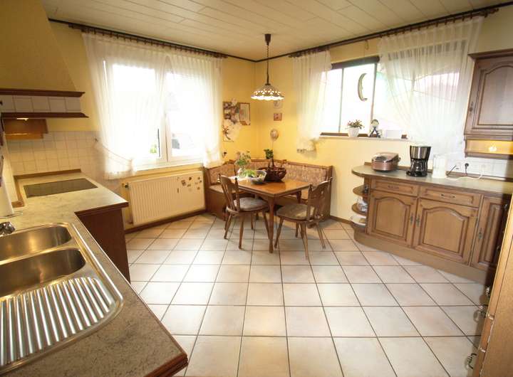 Ebenso sind im Erdgeschoss die Küche, das Wohn-/Esszimmer, ein Badezimmer, ein Gäste-WC sowie das Gästezimmer. Die lichtdurchflutete Küche bietet Ihnen viel Platz mit einem zusätzlichen Esstisch.