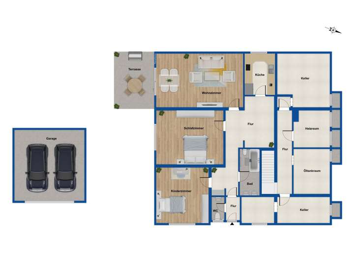 Diese Immobilie bietet außergewöhnliche Flexibilität in der Nutzung und eröffnet vielfältige Umbau- und Erweiterungsmöglichkeiten. Eine große Doppelgarage mit elektrischem Tor ist ebenfalls vorhanden.