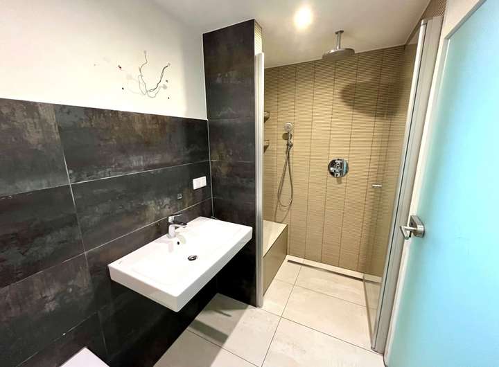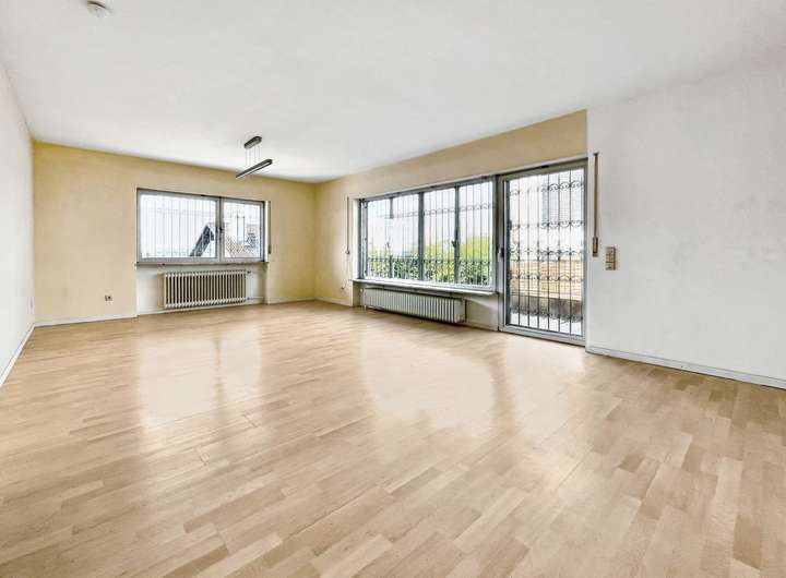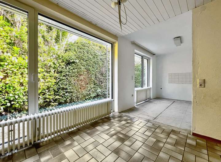 Im Erdgeschoss befindet sich derzeit eine 3-Zimmer-Wohnung mit Bad, Gäste-WC, Sonnenterrasse und direktem Zugang zum Garten.