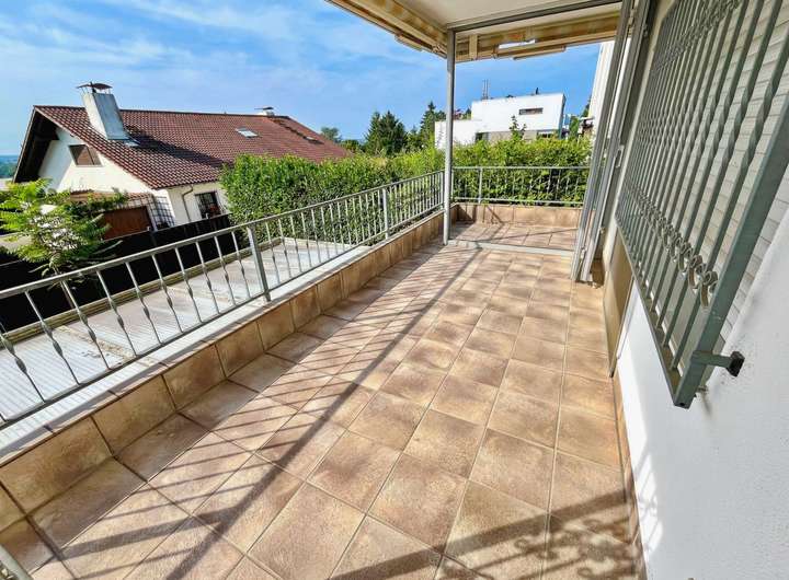 Im Obergeschoss liegt eine 4-Zimmer-Wohnung mit zwei Bädern, Gäste-WC und einem großzügigen Balkon mit herrlichem Weitblick.