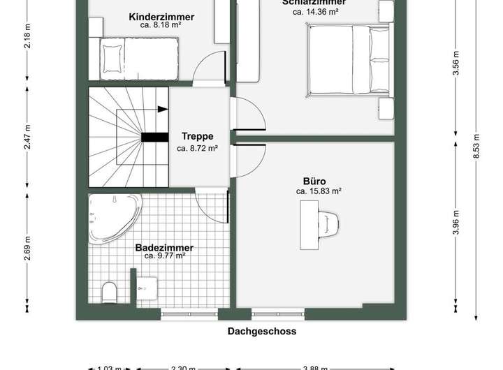 - DG: 3 Zimmer, großes Bad mit Eckwanne