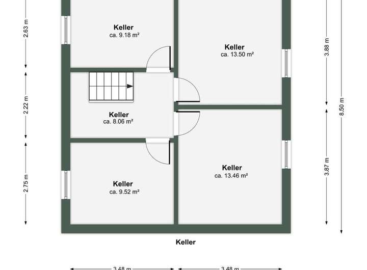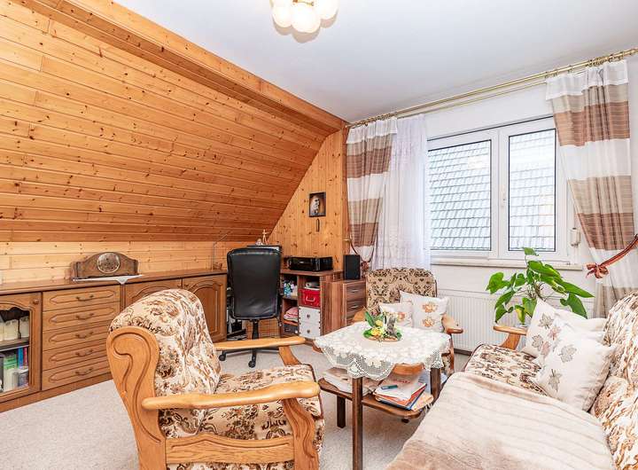 Mit ca. 100 m² Wohnfläche über 1,5 Etagen bietet es ausreichend Platz für eine Familie. Im Erdgeschoss erwarten Sie ein gemütliches Wohnzimmer, eine Küche sowie ein modernes Badezimmer mit bodentiefer Dusche. Im Dachgeschoss stehen drei weitere Zimmer zur Verfügung, die sich als Schlafzimmer, Kinderzimmer oder Arbeitszimmer eignen. Ergänzt wird die Etage durch ein großzügiges Bad mit Eckbadewanne. Das Haus ist voll unterkellert (ca. 54 m²) und bietet dort mit vier Räumen zusätzlichen Stauraum oder Platz für Hobby und Vorräte.
